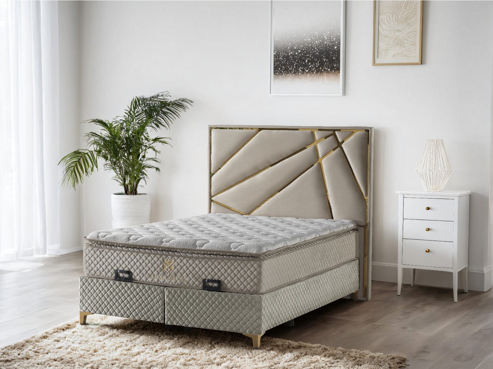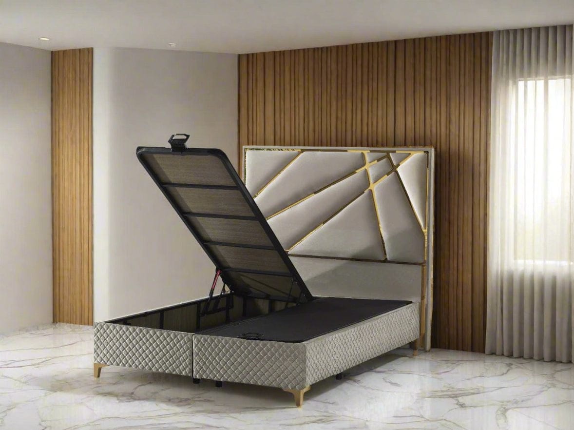 Paired with a front-opening divan base, the Helix Bed Set offers generous hidden storage without compromising on style. The combination of soft champagne tones and metallic gold accents makes this bed ideal for contemporary, luxury-inspired interiors.