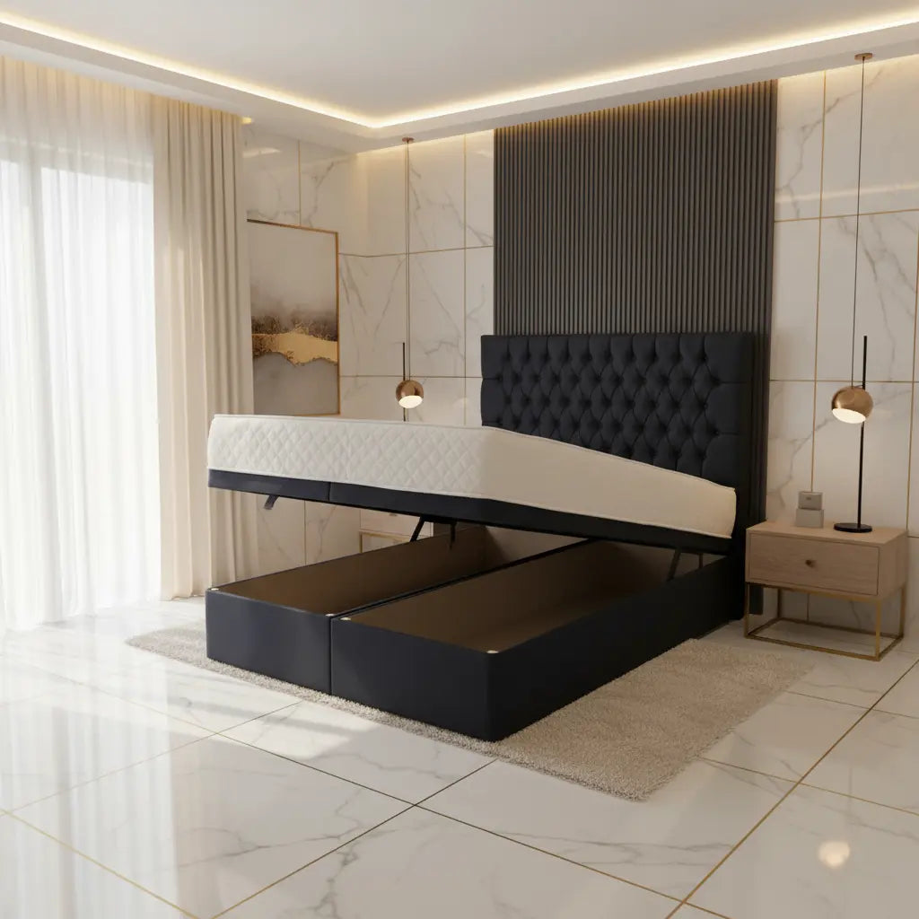 • Divan-style base with front or side-opening gaslift storage