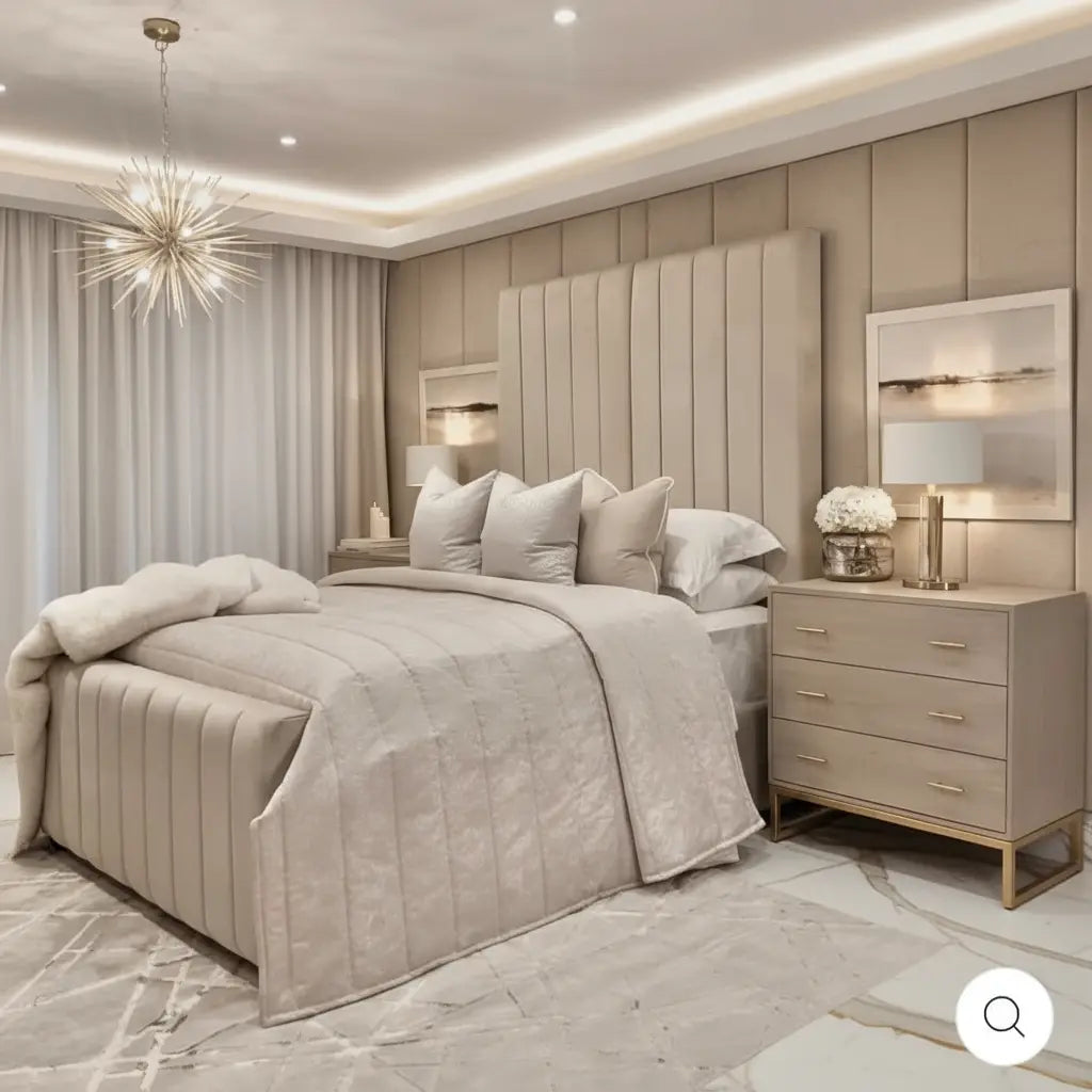 Styled in a neutral plush velvet finish, the Louisiana Bed adds warmth and luxury to any bedroom. Pair it with gold-accented lighting, soft layered bedding, and matching bedside drawers for a timeless, hotel-inspired feel.
