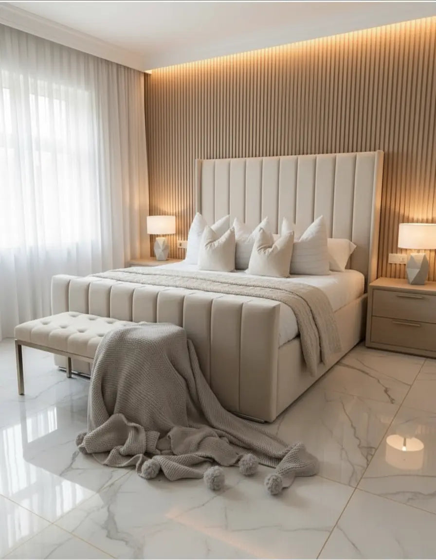 Wingback Headboard – Elegant curved wings and deep fluted upholstery for a luxurious statement look.
