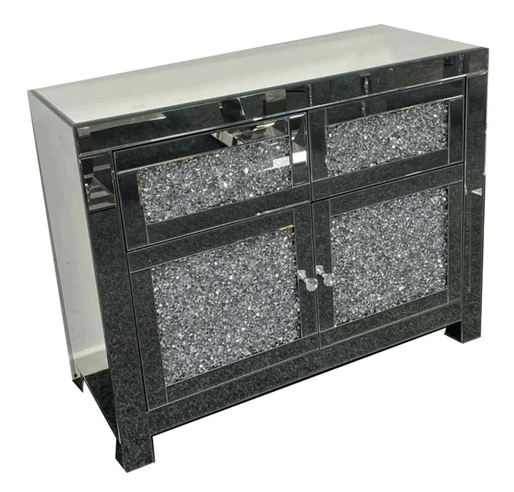 Crafted with a high-shine mirrored frame and dazzling crushed diamond inlays, this piece reflects light beautifully, instantly brightening any room. Compact yet functional, it features two central drawers and two side cupboards — ideal for storing dinnerware, linens, or personal accessories while keeping your space stylishly organised.