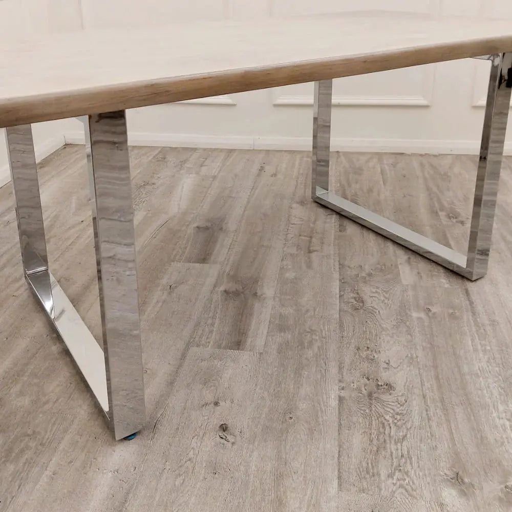 Elevate your dining experience with the Freya 1.8m Dining Table, a stunning blend of rustic charm and contemporary style. Crafted from solid light pine wood, this table exudes natural warmth, durability, and timeless character, while the sleek chrome metal legs provide a modern, sophisticated contrast.