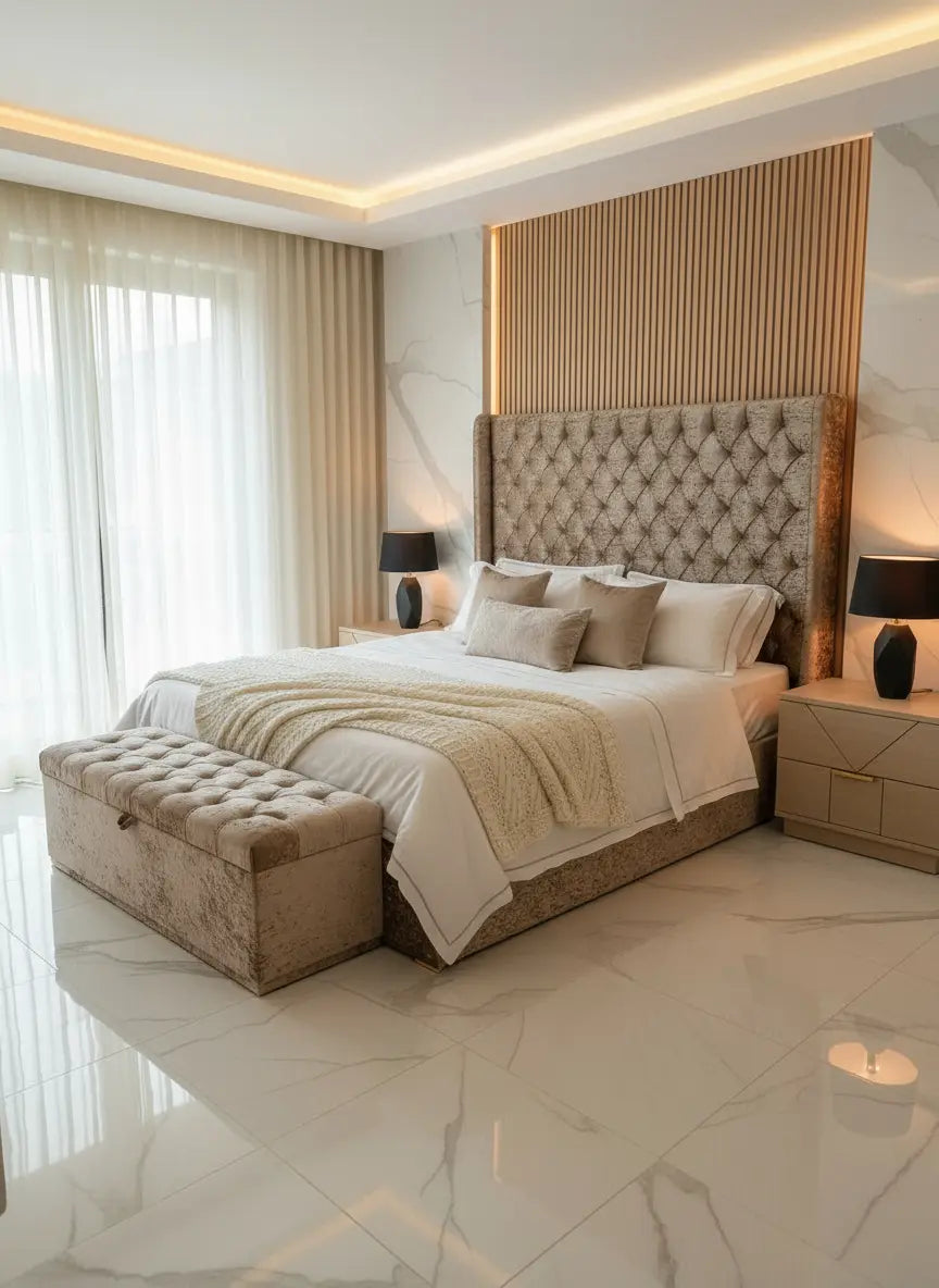 The Alexandra Crushed Velvet Ottoman Bed is a statement of timeless glamour and modern practicality. Featuring an impressive 72-inch tall Chesterfield headboard, this bed captures the essence of luxury with its deep-buttoned detailing and hand-finished crushed velvet upholstery. Designed for both comfort and style, it transforms any bedroom into a true centrepiece.