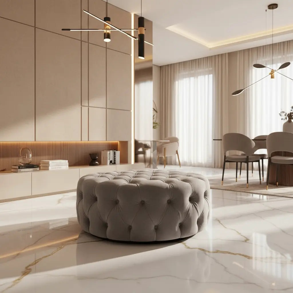 With its fully upholstered round frame and deep-button detailing, this footstool offers both visual appeal and practical comfort — perfect as a finishing touch to your sofa or as a standalone statement in any room.