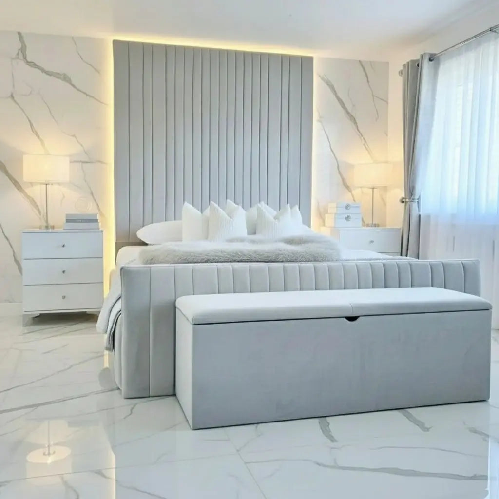 ✔ Tall Panelled Headboard – Sleek vertical fluting for a sophisticated statement look.