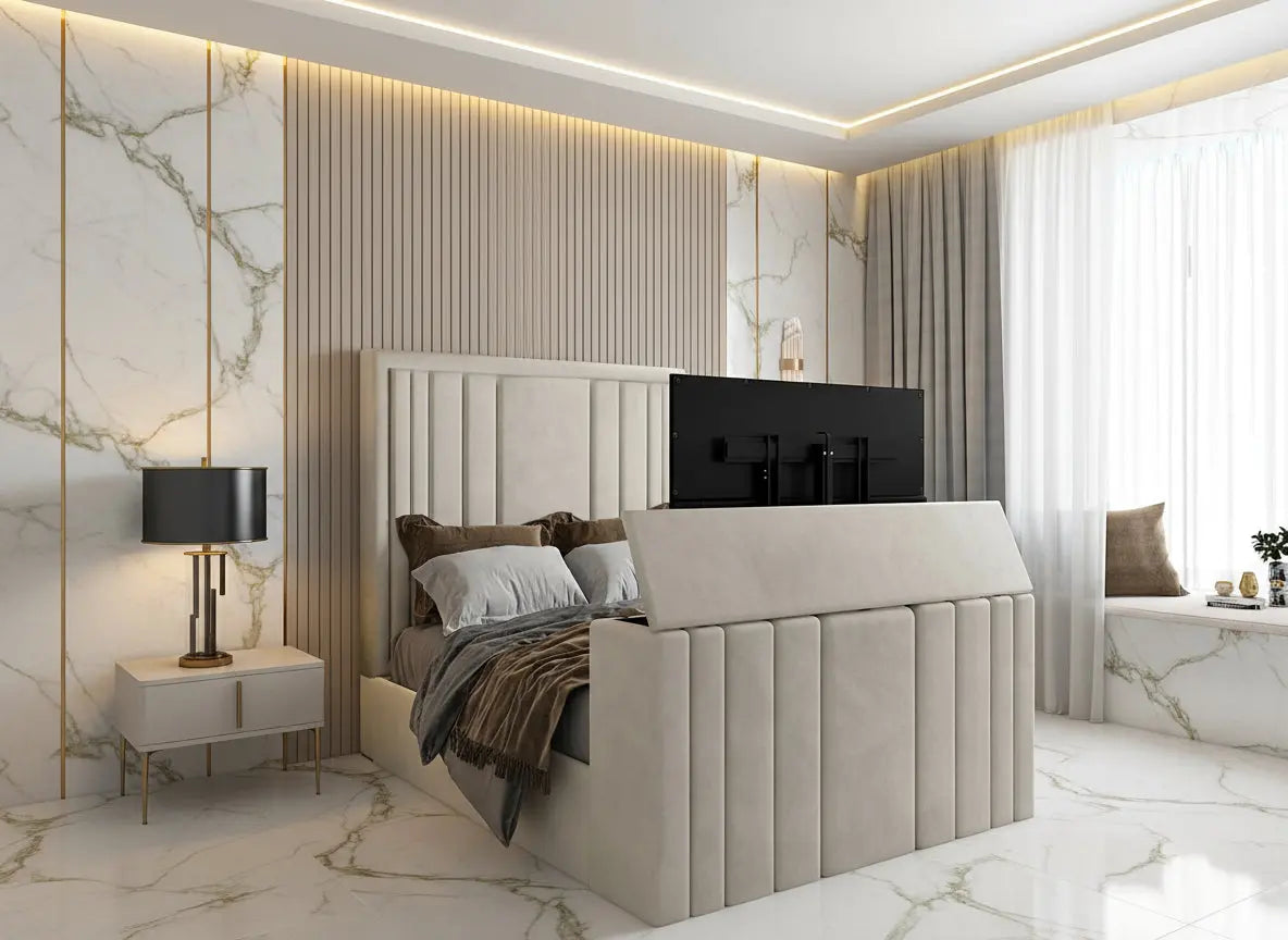Experience the perfect blend of comfort, luxury, and innovation with the Luxor Upholstered TV Bedframe. Handcrafted in the UK, the Luxor combines timeless design with modern technology, featuring an integrated TV lift mechanism discreetly housed within the footboard — compatible with TVs up to 47 inches wide.