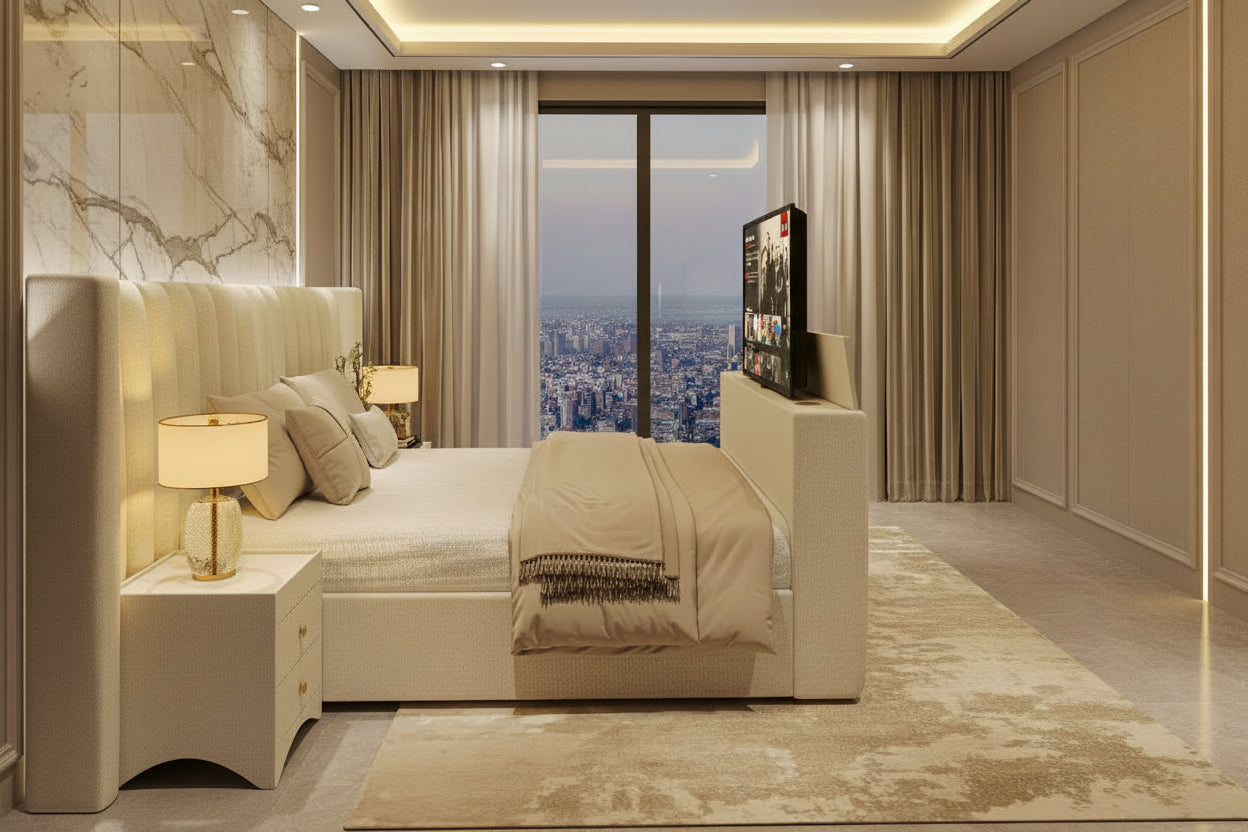 Discreetly built into the footboard is a smooth, motorised TV lift system. At the touch of a button, your television rises quietly into view and lowers away just as easily when not in use. The mechanism supports screens up to 55 inches, keeping your room clutter free while delivering effortless entertainment.