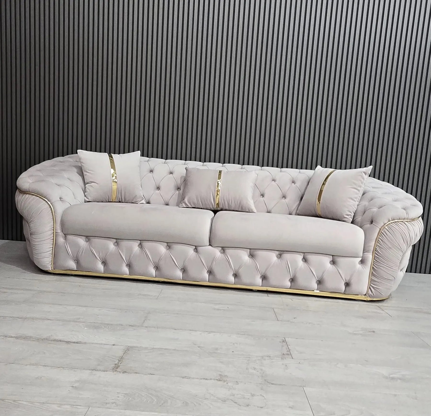 Elevate your living space with the Ambassador 3+2 Seater Sofa in luxurious champagne velvet with elegant gold accents. Combining sophisticated design with plush comfort, this stunning sofa set is perfect for hosting guests or relaxing in style. The foam-filled cushions provide superior support, while the gold detailing on the frame adds a touch of glamour, making it a true statement piece for any home.