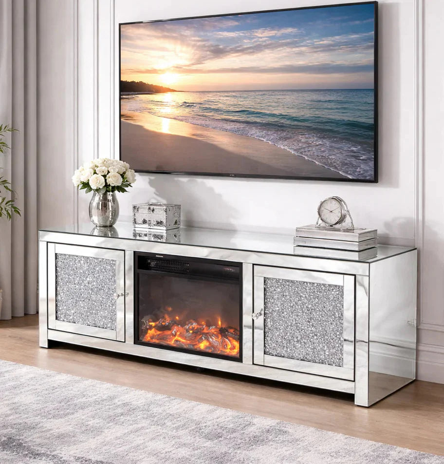 Upgrade your living space with the Roma Crushed Diamond TV Unit with Heater. This luxurious TV unit features dazzling crushed diamond detailing and a built-in heater, combining style and practicality in one elegant piece.